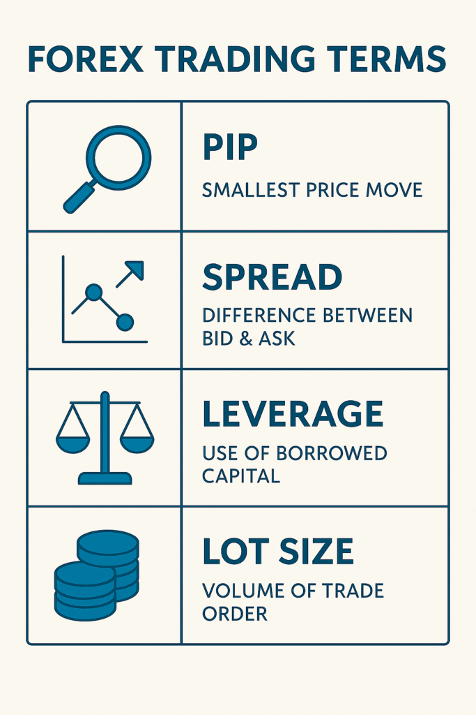 - Pip: The smallest price move a currency pair can make (usually 0.0001) , Learn more in this beginner’s guide to pip values.