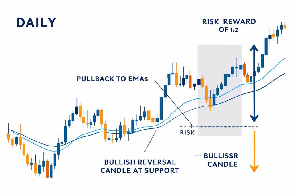 - Wait for pullbacks to major moving averages (20/50 EMA)